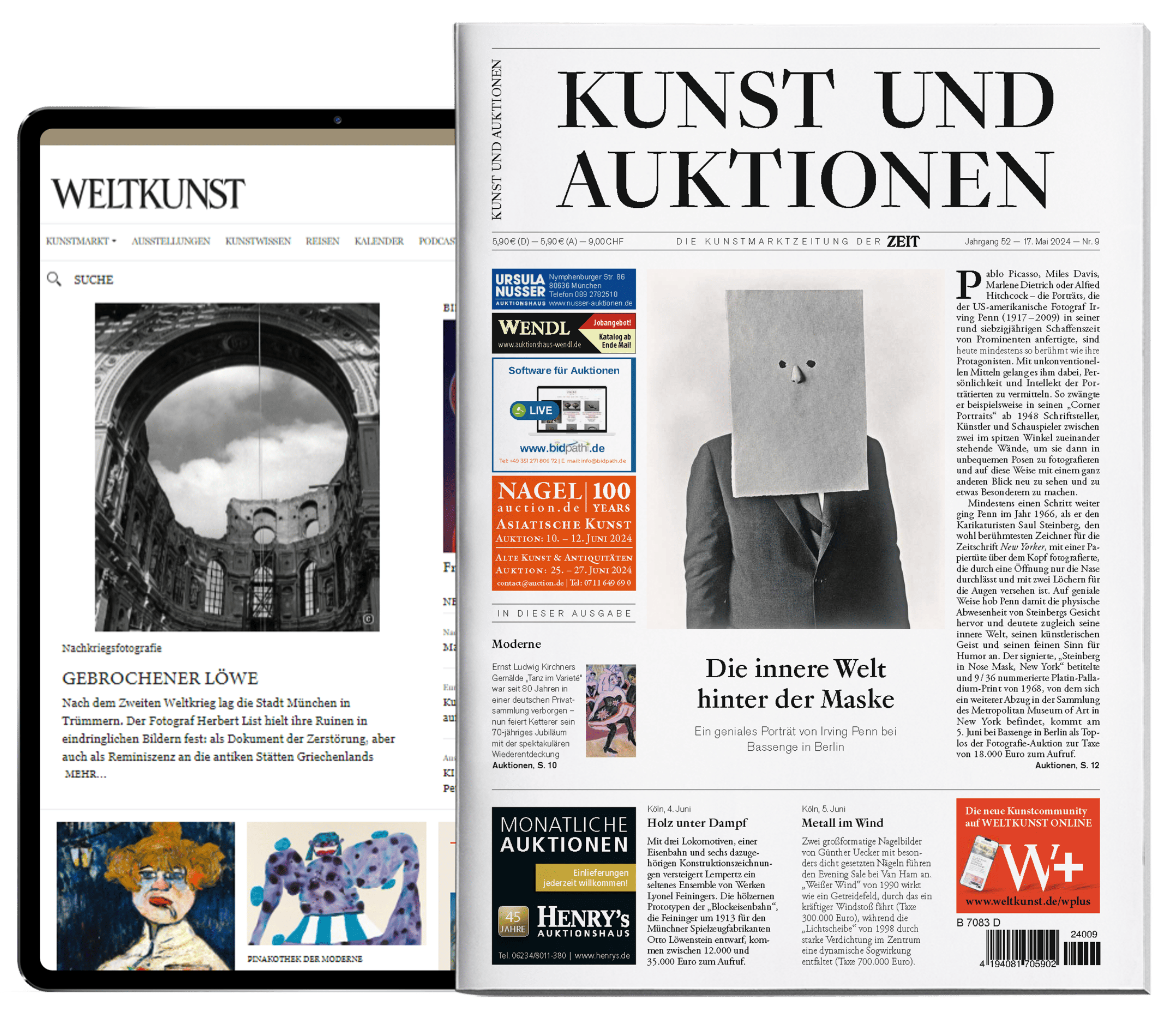 Zuverlässige Zahlen für Sammler:innen und Interessierte: KUNST UND AUKTIONEN ist die Premium-Entscheidungshilfe bei der Wahl von Kunstwerken und -handel. Mit fundierten Einblicken in aktuelle Trends, Preisdynamiken und das Auktionsgeschehen sind renommierte Häuser und kleine Galerien in einer hochgebildeten spitzen Zielgruppe präsent. Crossmediale Formate in der Print-Ausgabe und unter WELTKUNST ONLINE sorgen für einen Kommunikationsauftritt von Format.