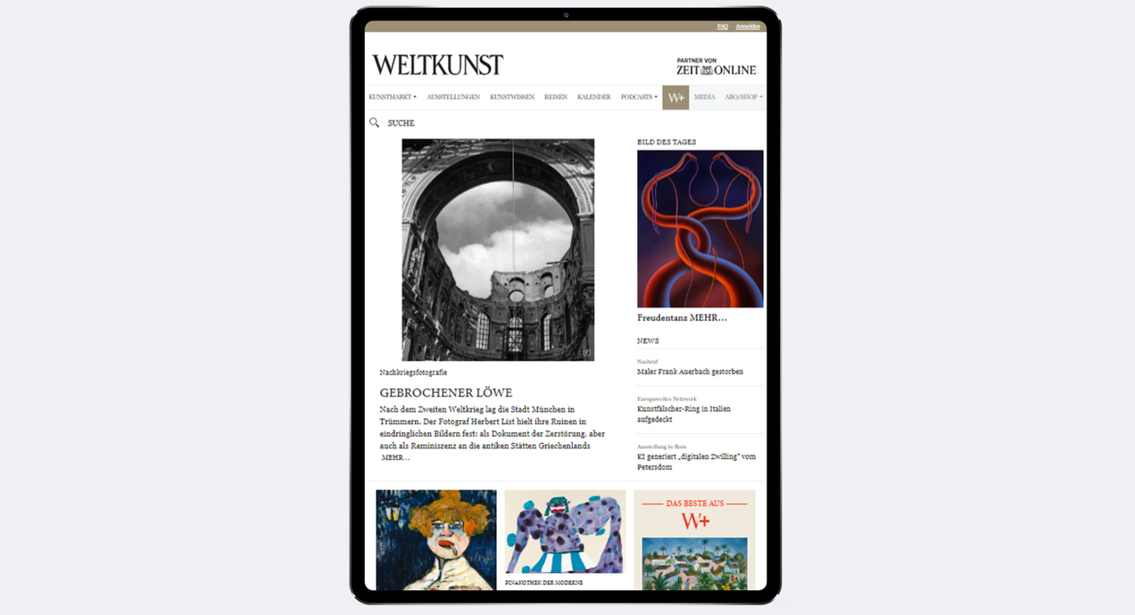 WELTKUNST ONLINE ist die digitale Präsenz der drei großen Printmarken WELTKUNST, KUNST UND AUKTIONEN und KUNSTQUARTAL. Das Portal erreicht eine exklusive, hochgebildete Zielgruppe, die Kunst erwerben möchte. Kampagnen profitieren von der Reichweite und der möglichen Verlängerung auf ZEIT ONLINE.